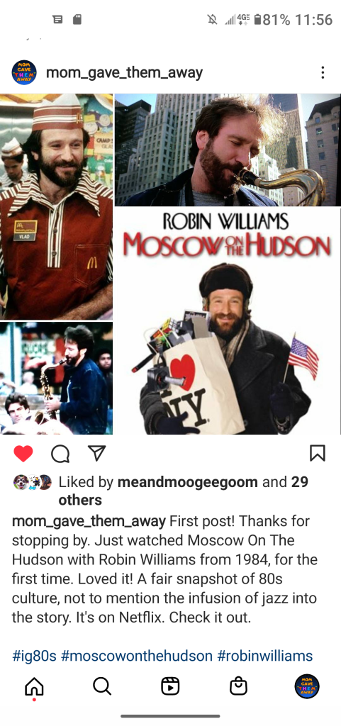 This week that account turned 5 years old, and I had forgotten to delete from my phone the pictures I used on my very first post, so Google reminded me of the anniversary. It’s strange seeing that first post and having nostalgia for a movie that I didn’t see as a kid. It was for the 1984 Robin Williams comedy-drama, Moscow on the Hudson, that I had finally watched. The flick was pretty big when it came out. Williams was enormous having recently added the notches of The Survivors, The World According to Garp, and Popeye to his belt. Not to mention the near decade prior of building his comedy chops in the stand-up world, and iconic sitcoms Eight is Enough, Laugh-In, Happy Days, and Mork and Mindy (NANU! NANU!).