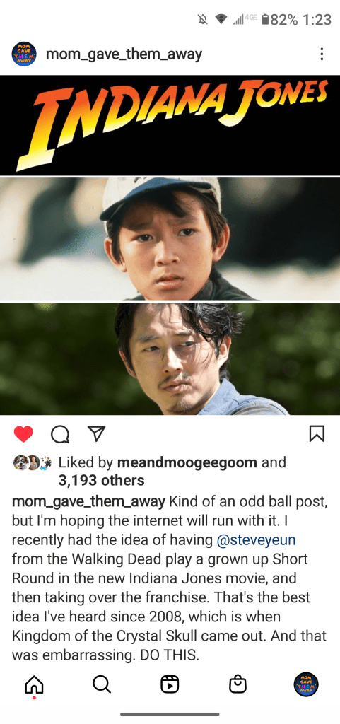One of my Instagram accounts is dedicated to preserving 80’s culture, and several years ago when the rumblings of this upcoming Indiana Jones movie started to hit the internet, I made a post and pitched what I would like to see for the final installment of Ford’s run as Doctor Jones. It involved the return of Quan’s character, Short Round, but I imagined the Walking Dead’s Steven Yeun in the role. He’s the perfect age, he’s got the acting chops and charisma, and he’s familiar enough with action. Add to the equation that Short Round is an in-continuity character that Indie fans know and love, and you’ve got the perfect baton pass to continue the franchise after Ford leaves. To date that’s my most liked post on that account.