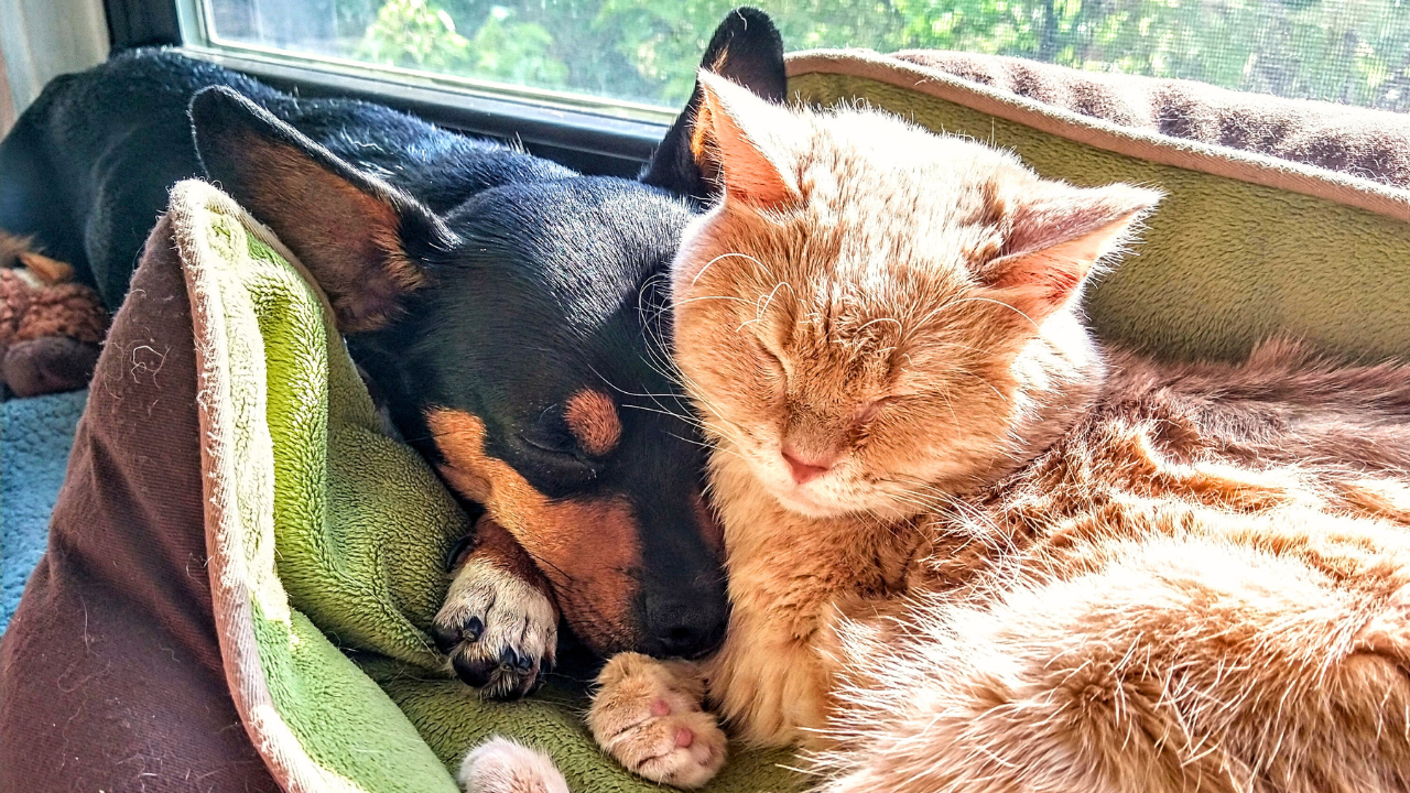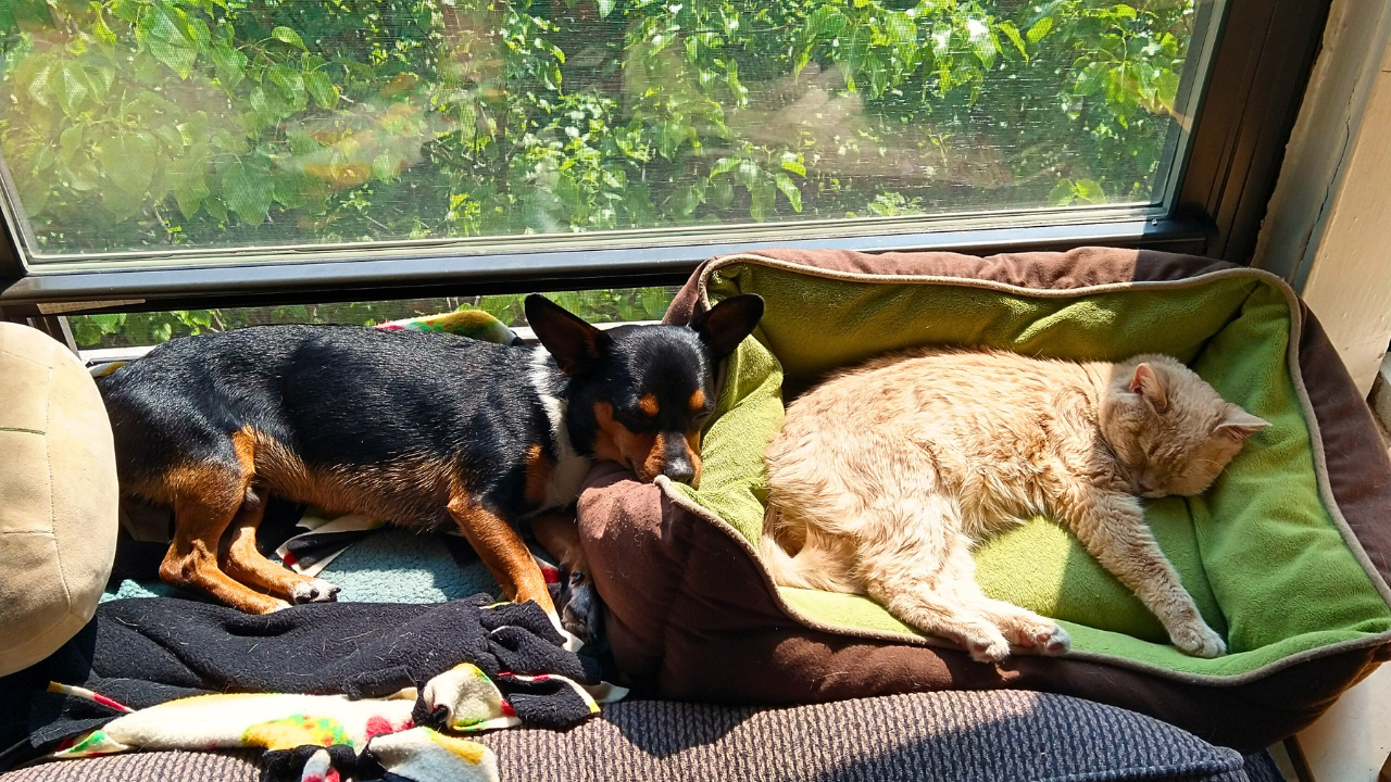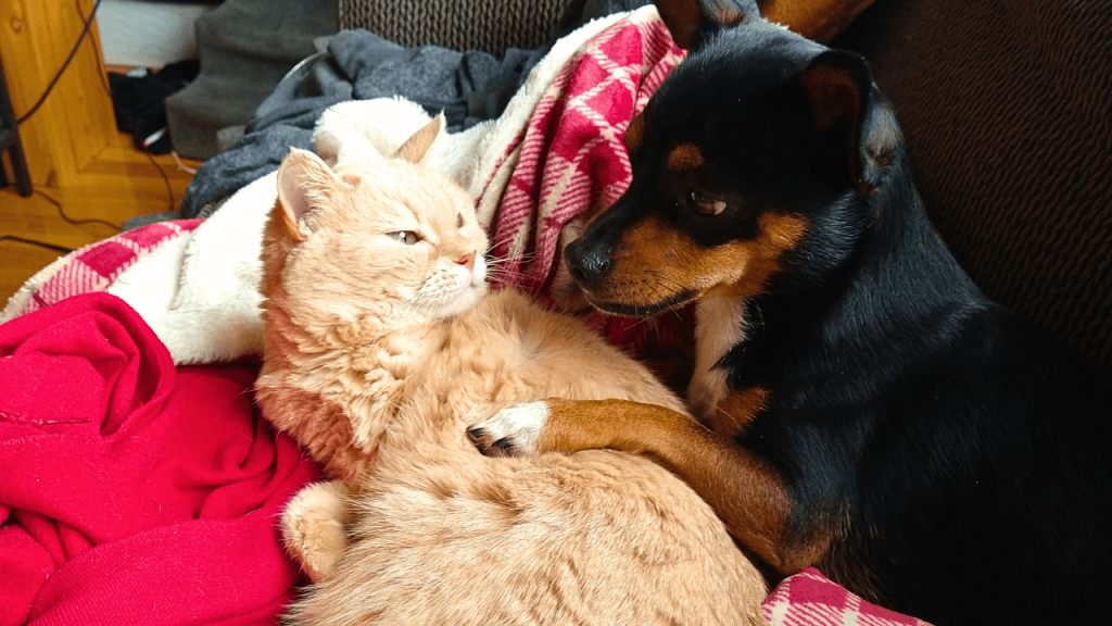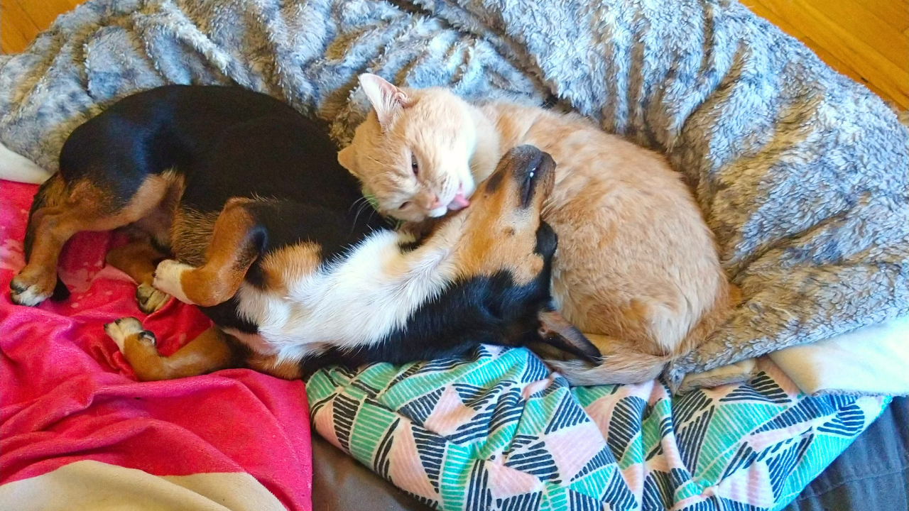 After my Mooge passed a couple of years ago, I rescued a new puppy, Egoom, and in so many ways, he has followed in her footsteps. One of which is his love for charging into apartments and befriending your cats. Just like his big sister, he and Muther Fluffer became friends, and every time he was in there, she’d come out to greet him and play for as long as the other two dogs would allow, which never was too long.
